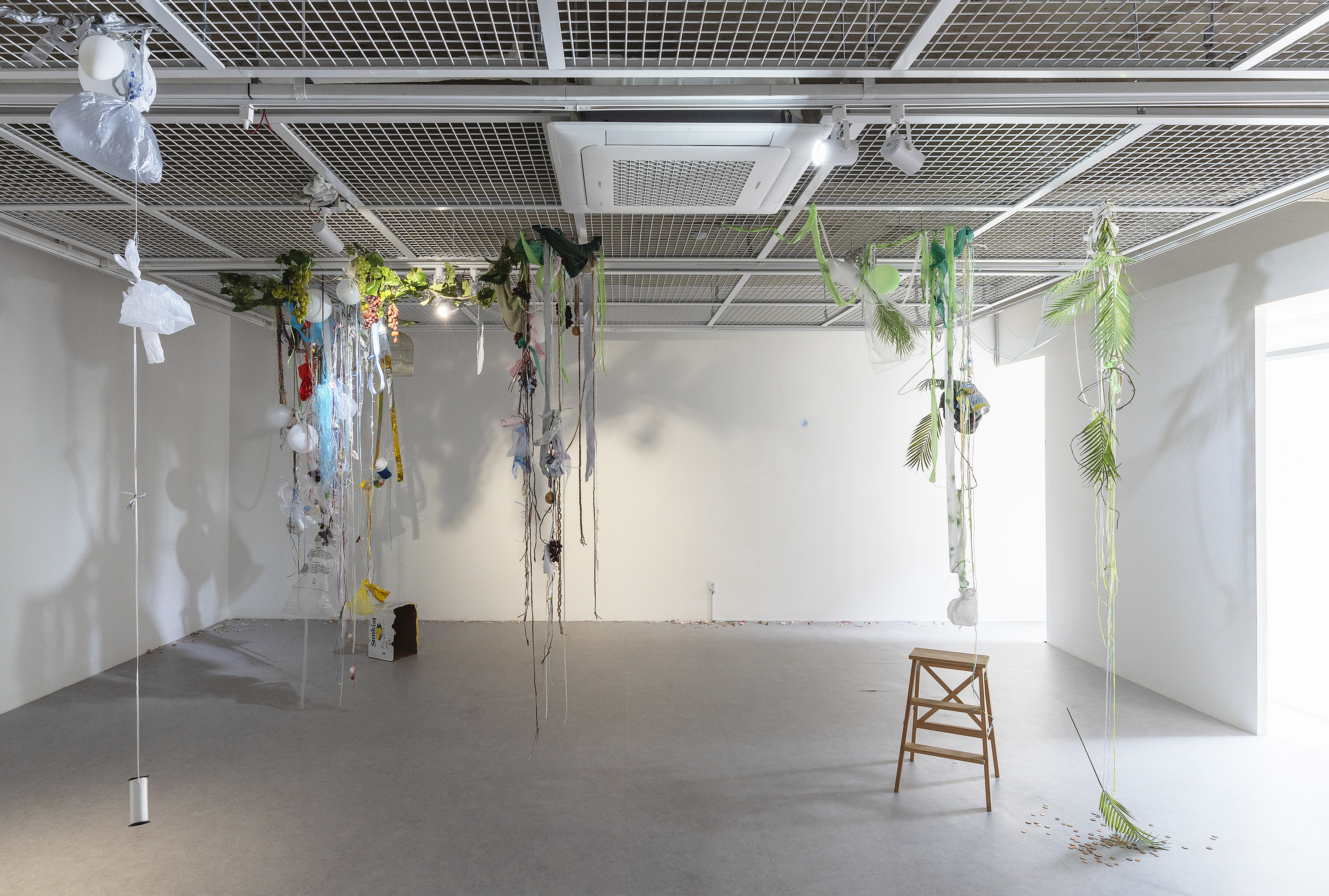 <느긋한 죽음, 계속되는 경련 Lazy Death, a Chain of Spasms>은 퍼포먼스에서 발표한 텍스트 중 [그 포도밭으로 To the Vineyard]와 [백색 빈민가 White Getto]를 토대로 구성한 공간 설치 작업이다. 밝고 반짝이는 사물들이 주를 이루는 이 작업에는 묶고 부풀려 조르는 질식과 매달리고 늘어진 목매닮의 이미지들이 곳곳에 감쳐줘있다. 너무도 멀쩡하지만 그 쓸모를 잃은 화려한 것은 과거의 즐거움이 끝났다는 절망을 강조한다. 글 [백색 빈민가] 에 등장하는 구절, “산 것은 다 죽어나가도 원래 싸구려 플라스틱은 거의 영원하대요”는 이 사물들의 의미없는 영원성에 대해 직설적으로 이야기한다. 여전히 죽음을 겪어내며 멍들고 썩어가는 포도의 형상과 함께 쓰레기, 비닐, 오래된 메달 등의 공산품의 온전한 외관은 극명한 대조를 이룬다. 이는 죽음의 대척점에 놓인 영원성에 대한 작가의 양가적 감정을 대변한다. 그는 영원을 동경하지만 시간 속에서 영원은 죽음보다도 더 쓸쓸한 것이라고 말한다.