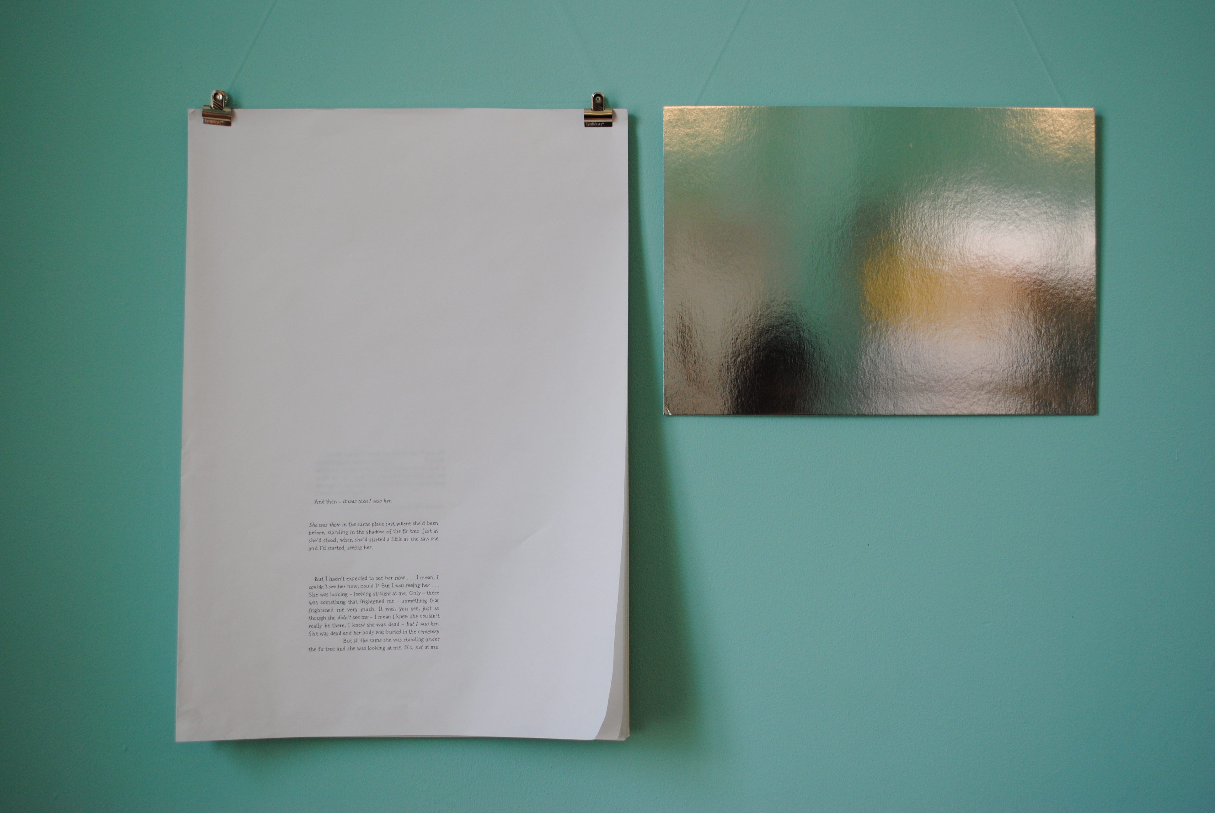 A mirrored paper, edited text (Original Book: "Endless Night" by Agatha Christie) on stacks of paper and audio installation, Narrated by Ultan Coyle